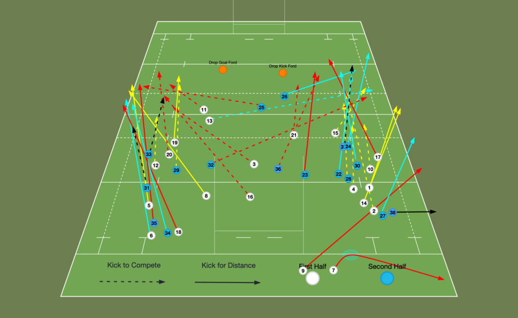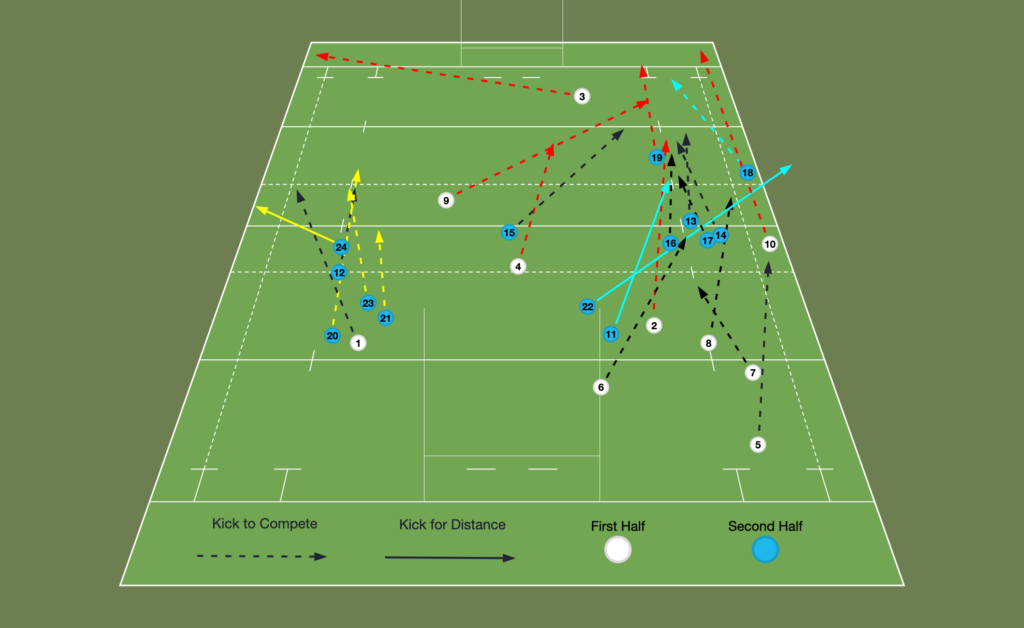 Within these maps, Black lines are kicks by Alex Mitchell, red the starting fly half, yellow Ben Spencer and blue by all other kickers.