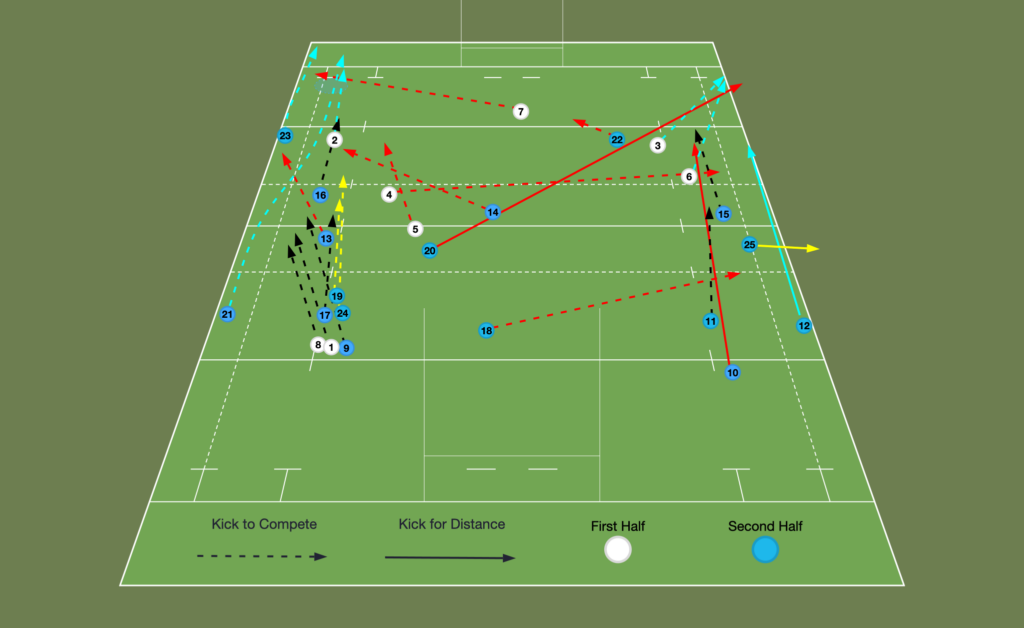 Let’s quickly look at Englands kick maps for the Autumn Internationals which illustrates where England utilise kicks. Note how many originate in Englands own half but also how many are kick to compete (dotted line).