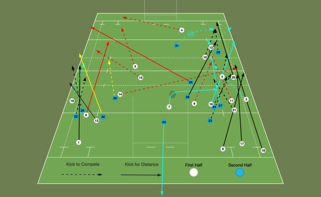 32 kicks were in their own 22, of which 22 were not kick to compete kicks (so defensive kicks for territory).